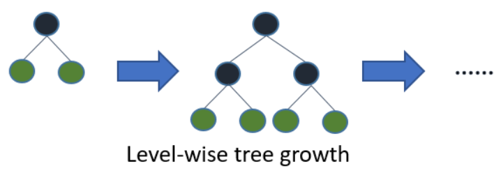 일반 GBM 계열의 트리는 level-wise(균형 트리 분할) 방식을 채택합니다. 그림을 보시면 알겠지만 항상 균형을 이루며 2진 분할을 하고 있습니다.