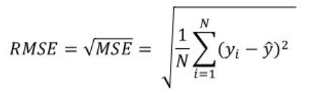MSE의 단점을 보완한 RMSE입니다. MSE에 루트를 씌운 형태입니다. MSE는 오류의 제곱을 구하므로 실제 오류보다 과하게 커지는(또는 과하게 작아지는) 특성이 있어 MSE에 루트를 씌운 RMSE를 사용합니다. RMSE를 사용하면 오류 지표를 실제 값과 유사한 단위로 다시 변환되어 해석을 쉽게하는 효과가 있습니다.