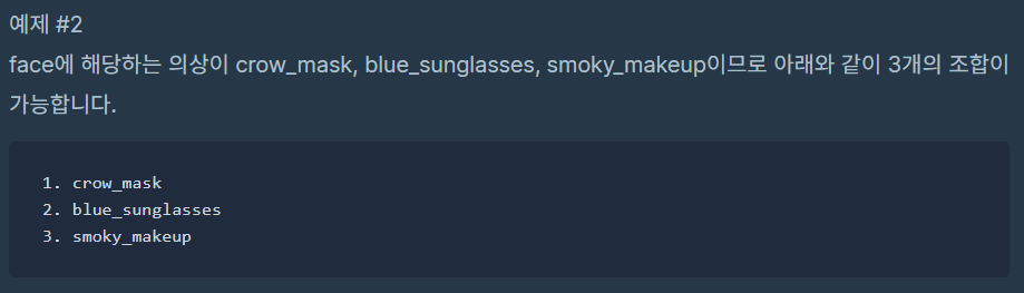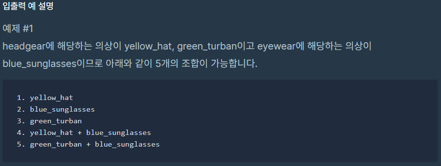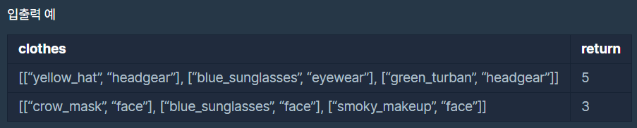 스파이가 가진 의상들이 담긴 2차원 배열 clothes가 주어질 때 서로 다른 옷의 조합의 수를 return 하도록 solution 함수를 작성해주세요.