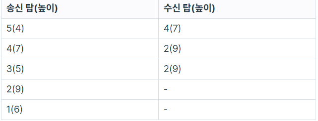수평 직선에 탑 N대를 세웠습니다. 모든 탑의 꼭대기에는 신호를 송/수신하는 장치를 설치했습니다. 발사한 신호는 신호를 보낸 탑보다 높은 탑에서만 수신합니다. 또한, 한 번 수신된 신호는 다른 탑으로 송신되지 않습니다.